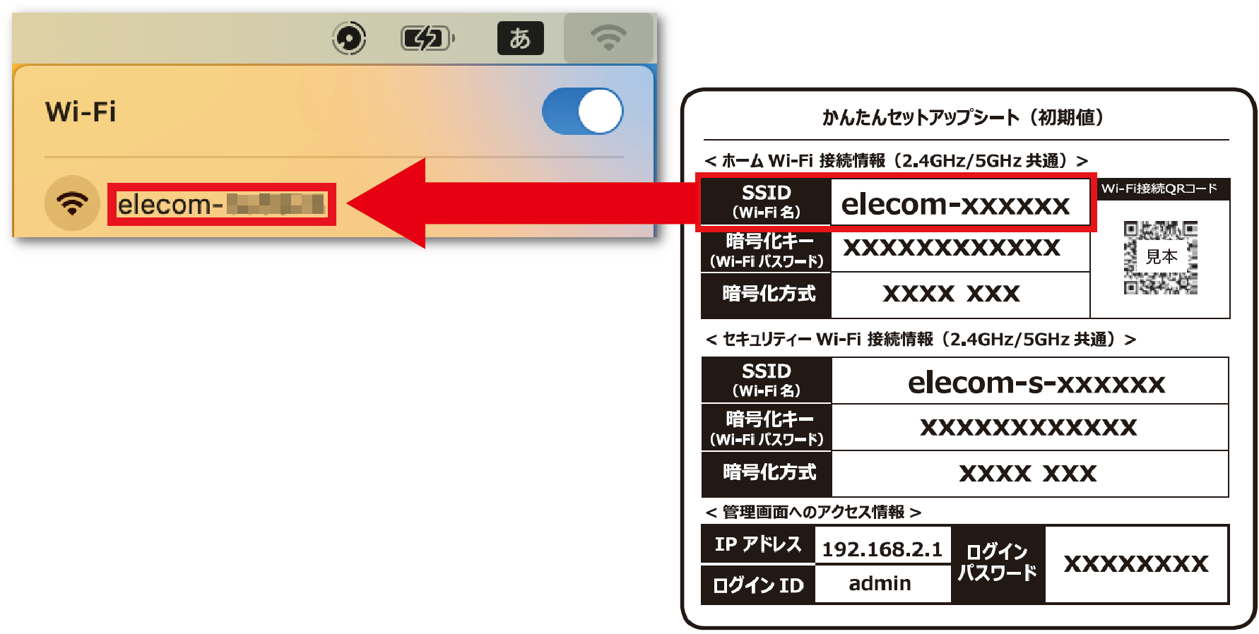 Wi-Fi接続する際のSSID名とWi-Fiパスワードは、かんたんセットアップシート(初期値)で確認できます。
