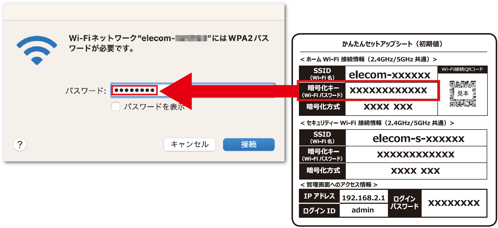 『パスワード』欄に、かんたんセットアップシート記載の暗号化キー(Wi-Fiパスワード)を入力します。