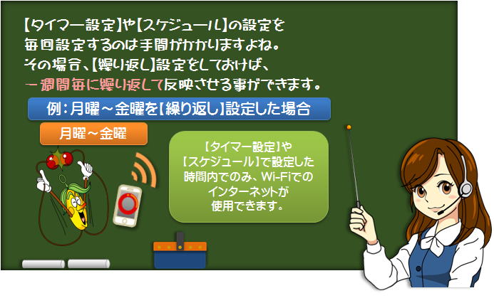 時間設定を行うと、登録した機器がインターネットに繋げられる時間を設定できます。